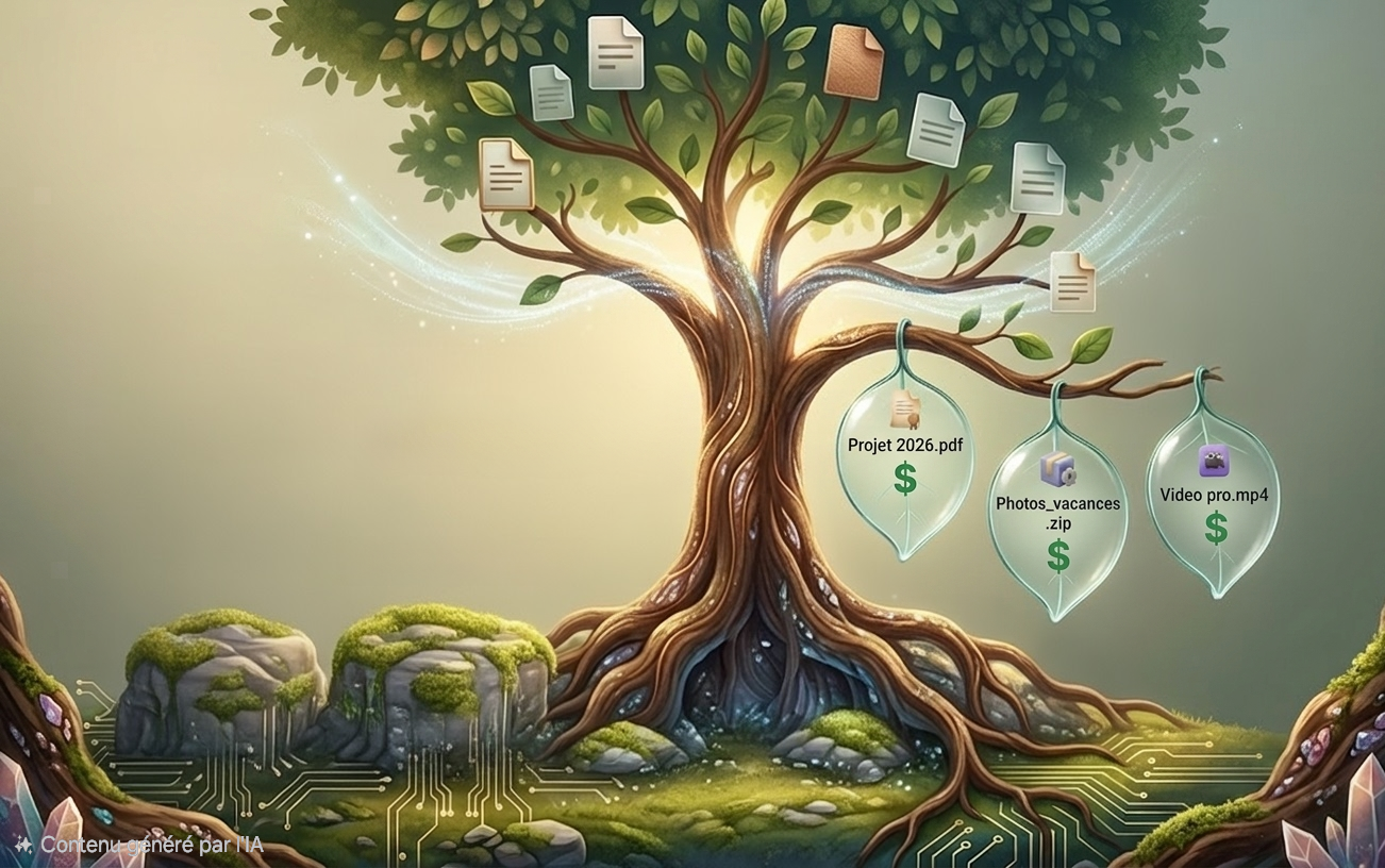 L’utilisateur voit une interface simple : fichiers, dossiers, liens, paiements, revenus et préférences.